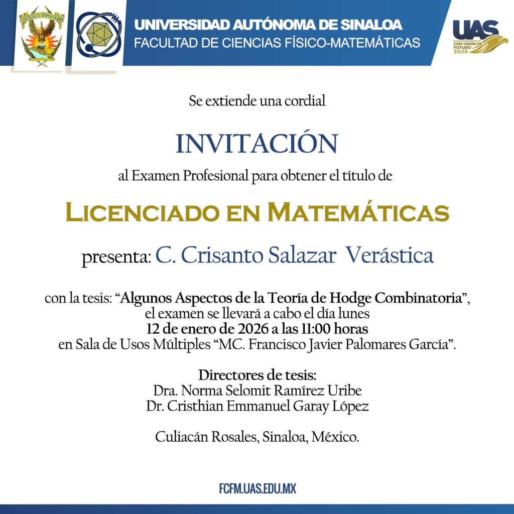 Se extiende una cordial invitación al público en general para asistir al examen profesional del C. Crisanto Salazar Verástica.