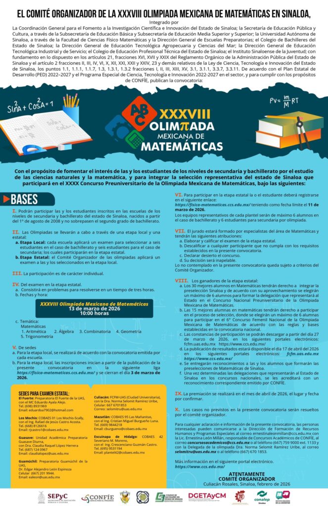 CONVOCATORIA ABIERTA para la XXXVIII Olimpiada Mexicana de Matemáticas en Sinaloa