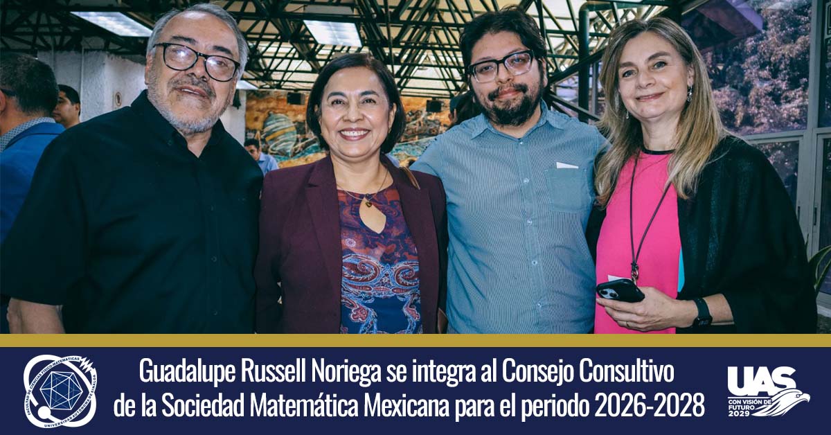 La doctora Guadalupe Russell Noriega, investigadora de la Facultad de Ciencias Físico Matemáticas (FCFM) de la Universidad Autónoma de Sinaloa (UAS), participó el pasado 4 de febrero en la toma de protesta de la nueva mesa directiva de la Sociedad Matemática Mexicana (SMM), celebrada en la Ciudad de México. En dicho acto, quedó formalmente integrado el consejo consultivo que acompañará los trabajos del periodo 2026-2028, del cual forma parte la académica sinaloense tras recibir el respaldo mayoritario de los integrantes de la asociación.